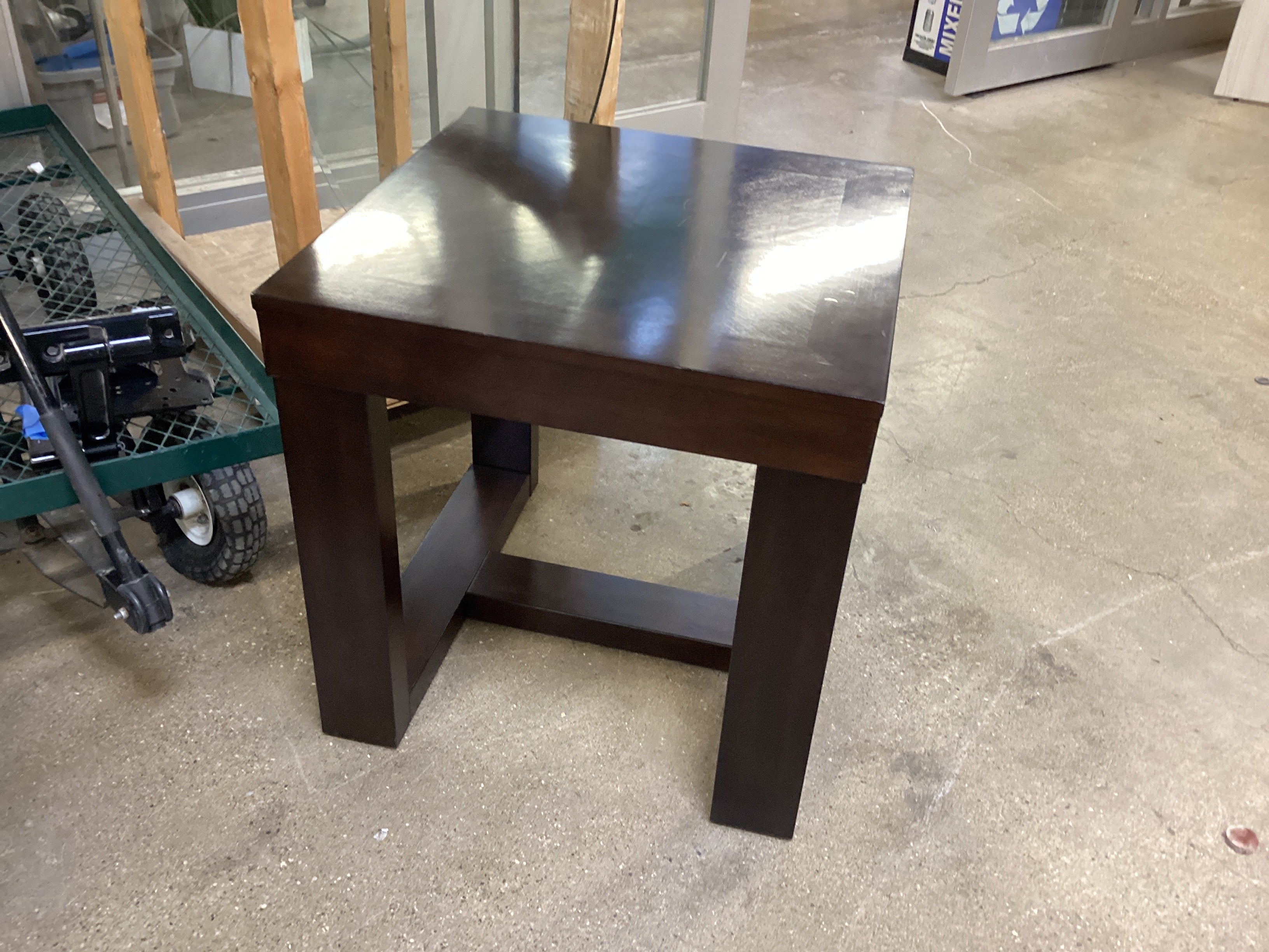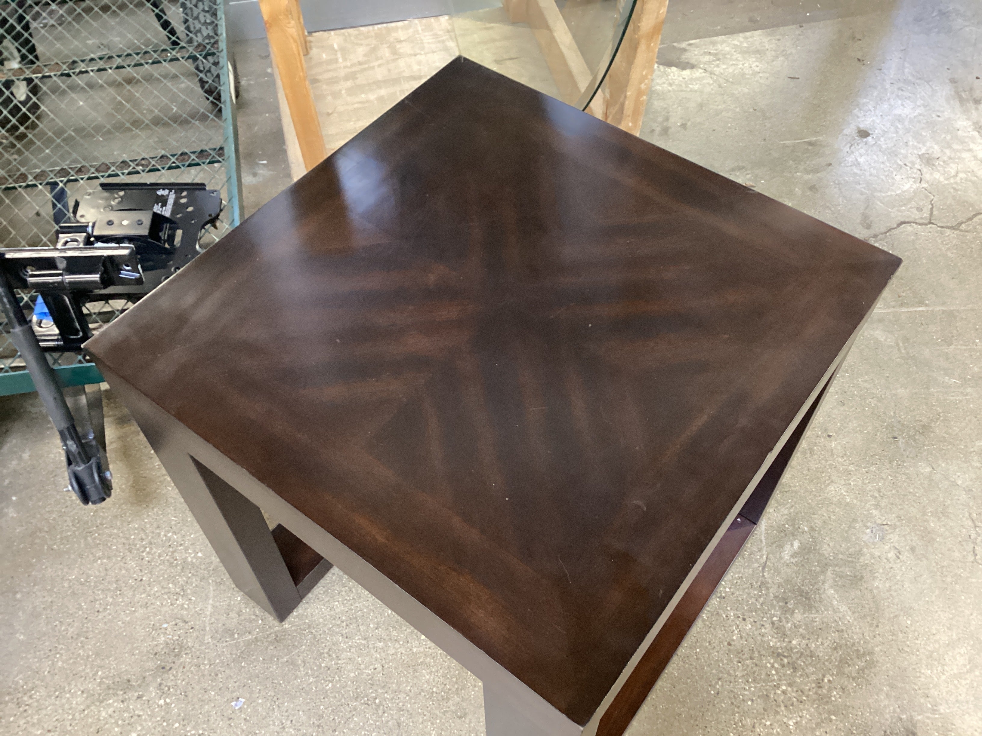 Square table with pretty grain pattern on top, likely veneer. Very sturdy. Read more